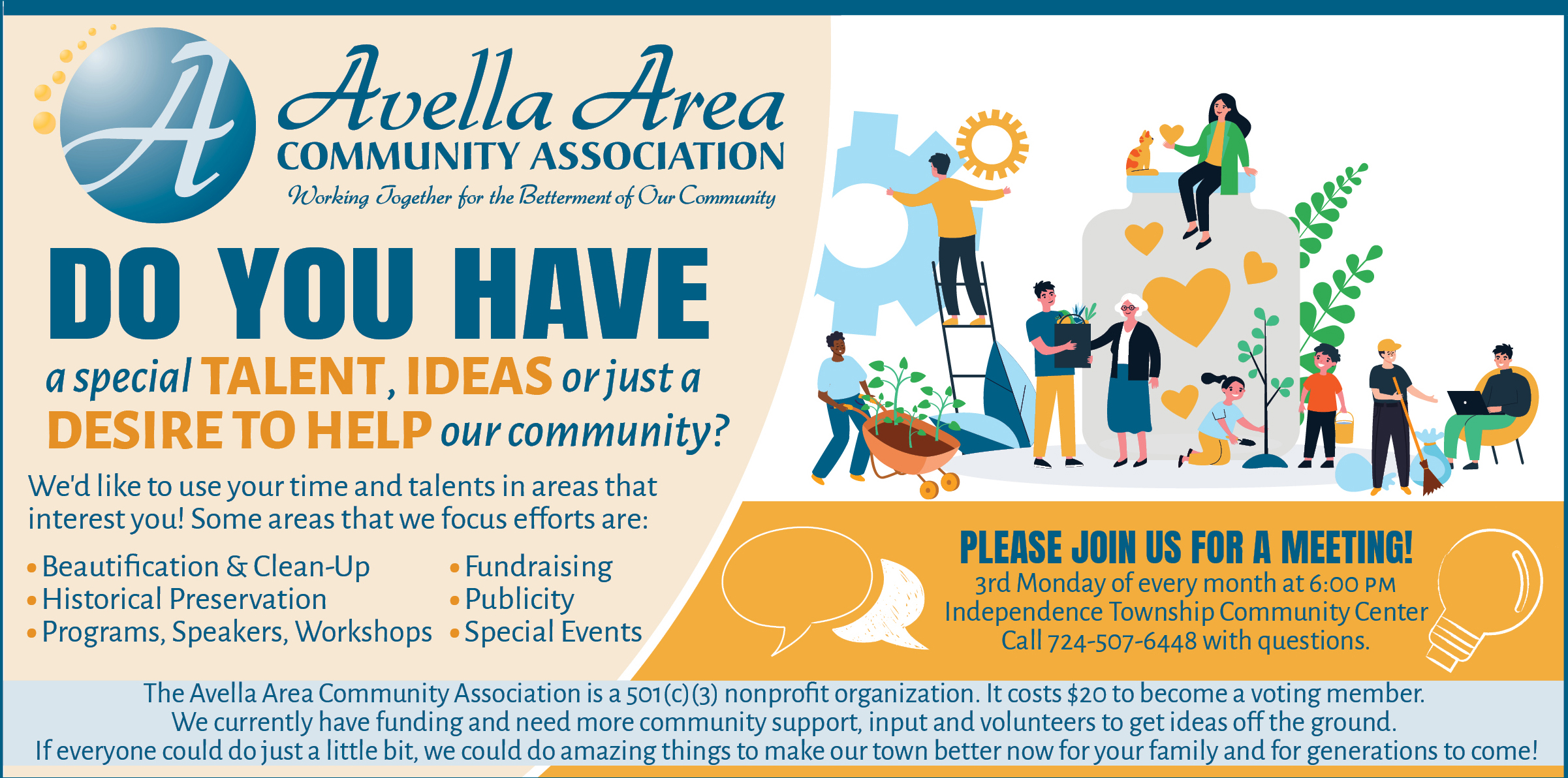 The Avella Area Community Association is a 501(c)(3) nonprofit organization. It costs $20 to become a voting member.